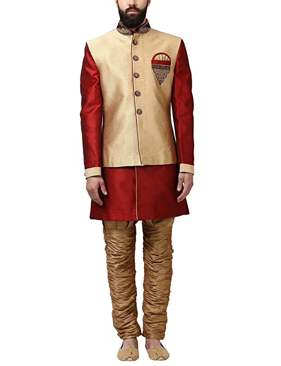 Description Add a hint of class to your overall persona wearing this gold colored indo-western set from the house of Ethnix. The blend of 80% polyester and 20% viscose fabric offers superior comfort and soft feel. Pair up this set with brown colored juttis. Additional Information ManufacturerRaymond Apparel Ltd. Item Weight1 kg 870 g Generic NameIndo Western Sherwani