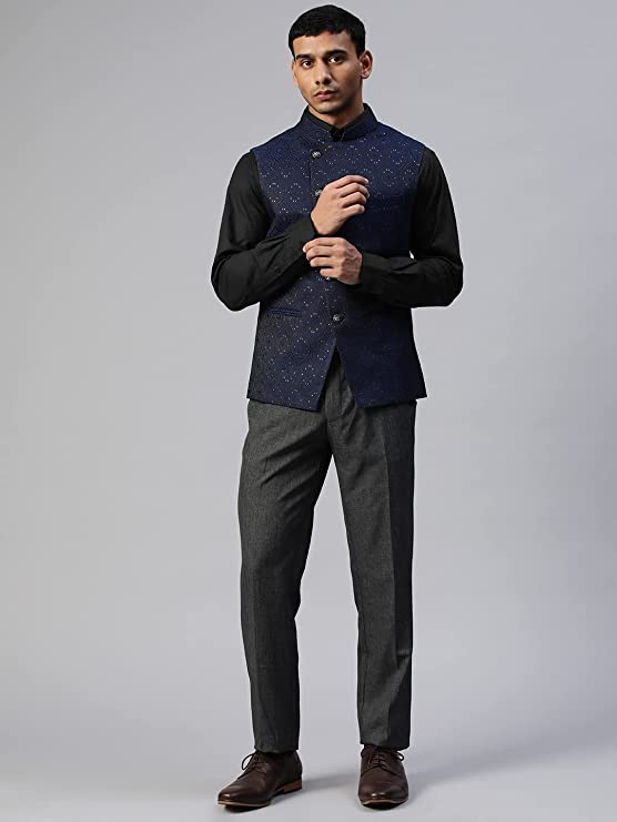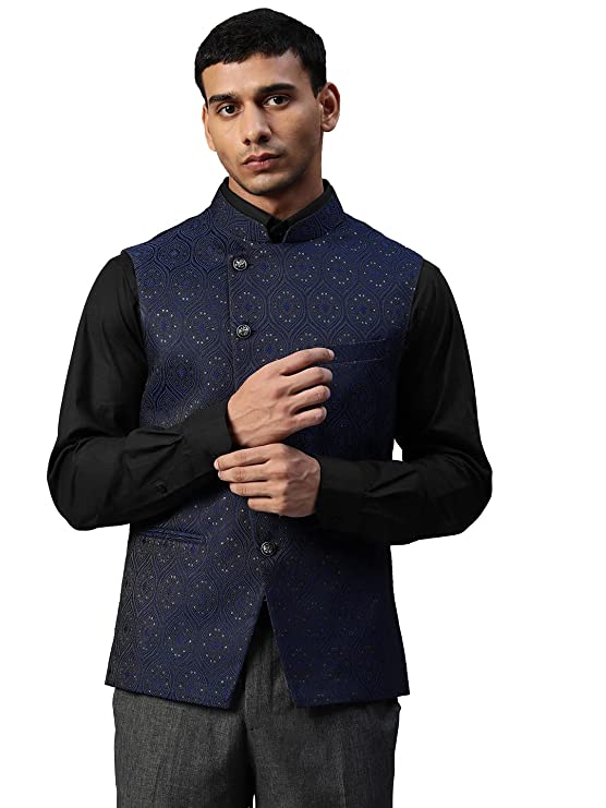 Product Details Material CompositionViscose Fit TypeSlim Closure TypeButton Collar StyleBand Country of OriginIndia About this Item Material: Jacquard Silk Pattern: Self design and Woven Recommended Wear: Festive, Party, Wedding, Evening and other occasions as preferred by the customer. Style Tip : This waist coat can be worn both casually and formally as a substitute to blazer in summers, Also can be paired with a jeans. Note:Waist area is alterable.