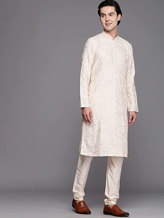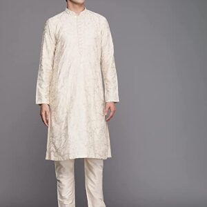 Manyavar Kurta Set for Men, Full Sleeves Mandarin Collar Ethnic Kurta Set for Engagement, Wedding, Party Printed (Off White)