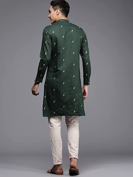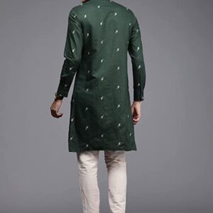 Manyavar Men’s Kurta, Full Sleeves Mandarin Collar Ethnic Knee-Length Kurta Only, Kurta for Festival, Wedding, Party, and Anniversary, Blended Linen (Green)