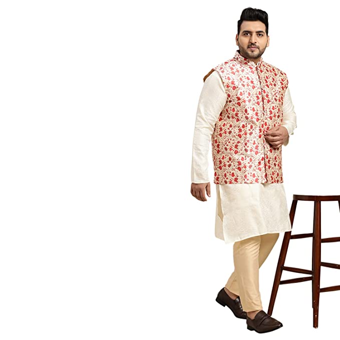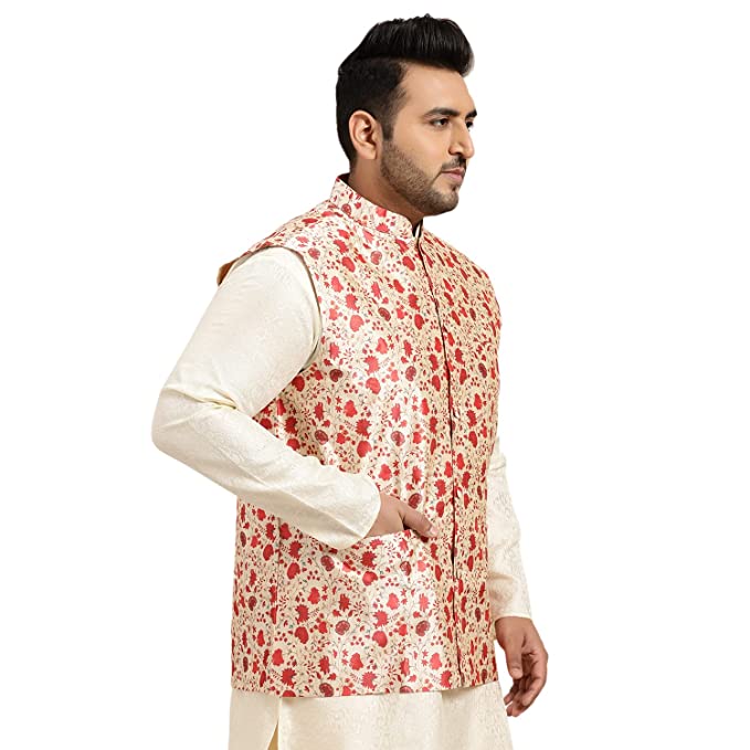 Product Details Material CompositionSilk Blend StyleNehru Jacket Neck StyleMandarin Neck PatternPrinted Country of OriginIndia About this Item Style: Men s Printed Nehrujacket, Fabric: Silk Blend Collar: Mandarin Collar Sleeves: Sleeveless, Fit type: Ethnic Comfort Product Size Guidance (A): Please refer to CHEST size measurement in the SIZE CHART for your correct size Fabric Care: 1st wash Dry Clean recommended, then normal Machine Wash at home. By: Daulat Ram Om Prakash (Since 1958), Chandni Chowk, Delhi: 110006, India