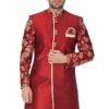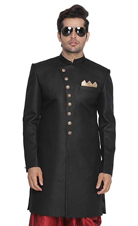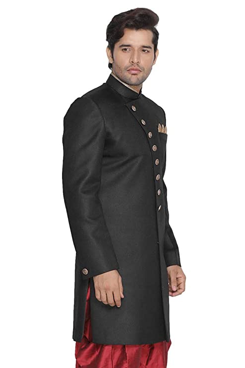 Product Details Material Composition70% Polyester, 30% Cotton Care InstructionsDry Clean Only Country of OriginIndia About this Item Fabric: Silk Blend Contents: a Indo Westen Style Sherwani Only Top Medium length and Regular Fit. Our Sherwani and Indo-western fitting is usually similar to a Regular Shirt s fitting. Select your Kurta size based on your chest dimension. Note: if one has a heavier abdomen compared to chest then he should select one size bigger kurta. Our Churidar Pajamas have drawstrings and a separate pocket attached to it. The pyjama bottom mohri is usually kept narror to bring out the best possible churi look. All our kurtas have five inches loosening over the body measurement. So if your chest round measurement is 38 inches then you should go for a 38 (Medium) size Kurta which will have a garment ready chest measurement of 43 inches. We offer six sizes – Small = 36 (Chest – 41), Medium = 38 (Chest – 43), Large = 40 (Chest – 45), X- Large = 42 (Chest – 47), XX – Large = 44 (Chest – 49) and XXX – Large = 46 (Chest – 51). Bored of a Modi Coat For Men or a koti for men stylish look with a Kurta Pyjama or a pathani suit for men stylish, jubba for men, panjabi for men or khan dress for men stylish then flaunt these stylish Shervani and be sure to turn heads! Also known as Achkan for men, Bandhgala for men or Jodhpuri for men. Wash Care Instructions: Dry Clean preferably or cold light wash Disclaimer: We have made a consistent effort to make the colors and finishes similar to the image of the products you see on screen. However, the actual product and the images on the website can differ! Customer s discretion is advised.