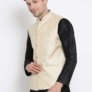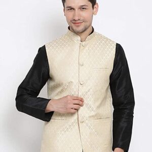 Product Details Care InstructionsDry Clean Only Occasion TypeFestival, Wedding, Party, Casual Sleeve TypeLong Sleeve Country of OriginIndia About this Item Fabric: Cotton Silk Blend Contents: a Men Banarasi Brocade Woven Jaquard Modi Jacket Select your Jacket size based on your chest dimension. Note: if one has a heavier abdomen compared to chest then he should select one size bigger Jacket. Jackets should have fitted look compared to a Kurta, All our ethnic jackets have four inches loosening over the body measurement. So if your chest round measurement is 38 inches then you should go for a 38 (Medium) size Kurta which will have a garment ready chest measurement of 42 inches. We offer six sizes – Small = 36 (Chest – 40), Medium = 38 (Chest – 42), Large = 40 (Chest – 44), X- Large = 42 (Chest – 46), XX – Large = 44 (Chest – 48) and XXX – Large = 46 (Chest – 50). Although popularly known as Modi Coat For Men or a koti for men stylish look with a Kurta Pyjama but can also be suitably used as pathani suit for men stylish, jubba for men, panjabi for men or khan dress for men stylish or Achkan for men, Bandhgala for men or Jodhpuri for men. We do v neck modi jackets too. Wash Care Instructions: Dry Clean preferably or cold light wash Disclaimer: We have made a consistent effort to make the colors and finishes similar to the image of the products you see on screen. However, the actual product and the images on the website can differ! Customer s discretion is advised.